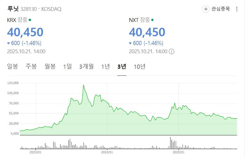항목 및 내용 (2025년 10월 21일 14시 기준) 현재가 40,450원 52주 최고/최저 85,800원 / 35,900원 최근 1년 수익률 -0.62% PBR (주가순자산비율) 약 7.07배 출처: 네이버 증권(2025년 10월 21일 14시 기준)