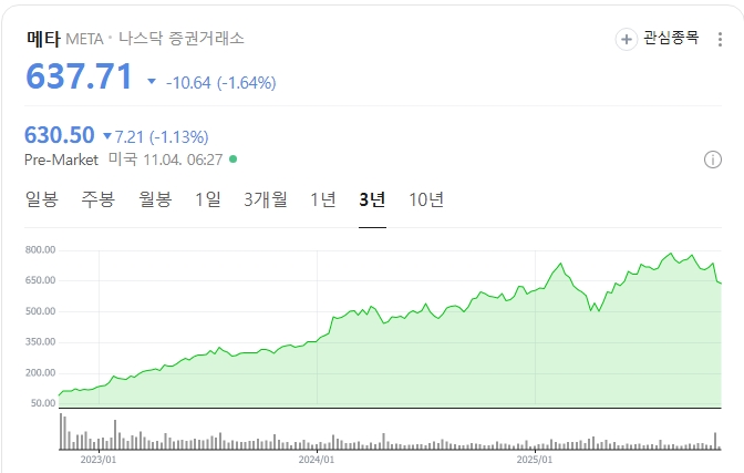 메타 주가는 3분기 실적 발표 직후 급격한 하락을 경험했습니다. (2025년 11월 3일 종가 $637.71 기준)