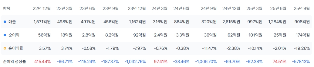 | 영업이익 | -29.9억 원 (적자) | -156억 원 (적자 심화) | (적자폭 422% 확대) |