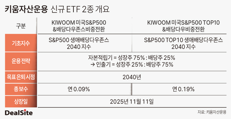 키움투자자산운용이 2025년 11월 7일에 새롭게 선보인 두 ETF, KIWOOM 미국S&P500&배당다우존스 비중전환과 KIWOOM 미국S&P500 TOP10&배당다우존스 비중전환이 바로 이 트렌드의 중심에 있는 상품들입니다. 이들은 투자 초기에는 높은 성장 잠재력을 가진 자산에 집중하고, 시간이 지날수록 현금흐름에 강한 배당 자산으로 비중을 서서히 전환하는 것이 핵심입니다.