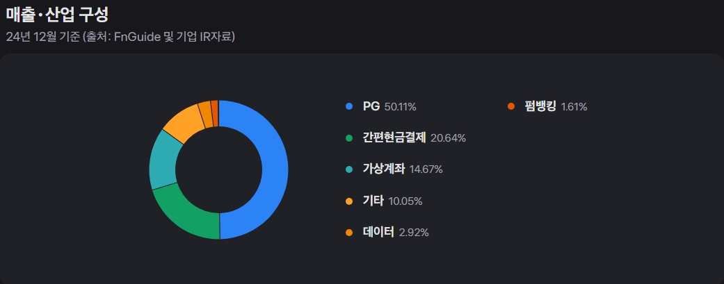 - PG (전자지급결제대행): 온라인 쇼핑몰 등에서 소비자가 카드, 휴대폰, 계좌이체 등 다양한 수단으로 결제할 때 이를 대신 처리하고 정산해주는 서비스입니다. 핀테크 기술력과 리스크 관리 역량을 바탕으로 안정적인 매출을 확보하고 있습니다.
