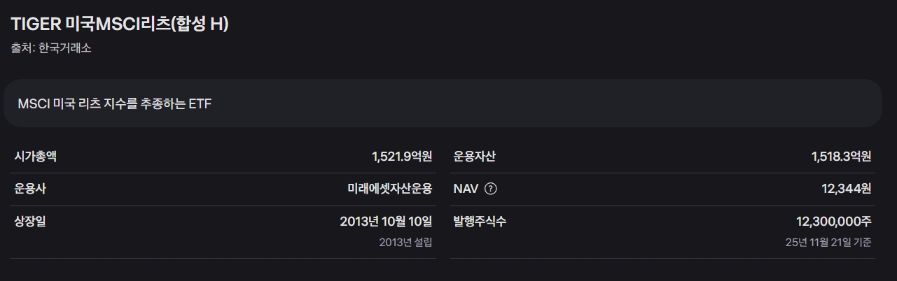 구분 내용 비고 ETF명 TIGER 미국MSCI리츠(합성 H) 환 헤지형 합성 ETF 운용사 미래에셋자산운용 국내 대형 자산운용사 상장일 2013년 10월 10일 비교적 안정적인 운용 추종 지수 MSCI 미국 리츠 지수 미국 리츠 시장을 대표 운용 규모 약 1,518.3억 원 안정적인 규모 (25년 11월 21일 기준) 운용 보수 연 0.24% 비교적 낮은 비용 구조 환 헷지 (H) 환 헷지 (H) 적용 환율 변동 위험을 줄임 분배금 지급 매월 (최근 12개월 12회) 투자자에게 규칙적인 현금 흐름 제공 시가 배당률 연 3.70% 안정적인 수준의 배당 (최근 12개월 기준) 현재 주가 12,344원 (25년 11월 21일 기준) 상품의 핵심은 '환 헷지(H)'와 '월 배당'입니다. 환율 변동에 대한 걱정을 줄이고, 매월 규칙적인 현금 흐름을 만들어준다는 점에서 안정적인 투자를 선호하는 분들에게 특히 매력적입니다.