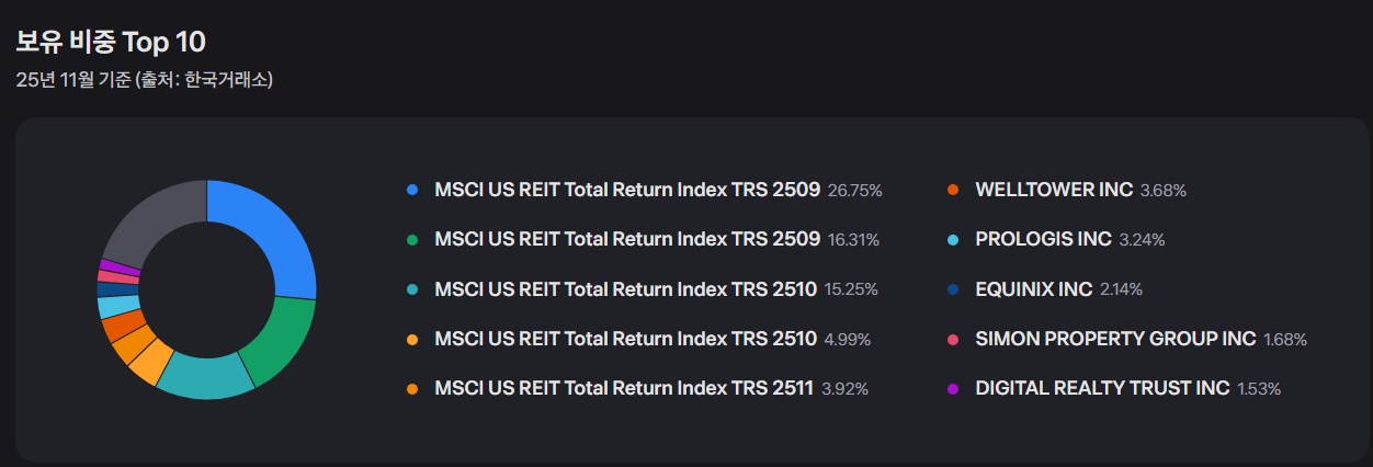 순위 종목명 비중 (%) 섹터 비고 1 WELLTOWER INC 3.68% 헬스케어 리츠 고령화 트렌드 수혜를 받는 헬스케어 시설 2 PROLOGIS INC 3.24% 물류/산업용 리츠 이커머스 성장에 필수적인 물류 창고 운영 3 EQUINIX INC 2.14% 데이터센터 리츠 클라우드, AI 확산의 핵심 인프라 4 SIMON PROPERTY GROUP INC 1.68% 쇼핑몰 리츠 우량 지역의 대형 쇼핑몰 운영 5 DIGITAL REALTY TRUST INC 1.53% 데이터센터 리츠 글로벌 데이터센터 플랫폼 제공