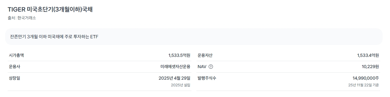 출처 토스증권 구분 내용 비고 운용사 미래에셋자산운용 국내 톱티어 자산운용사의 안정적인 운용 상장일 2025년 4월 29일 2025년 상반기에 상장한 비교적 신규 ETF입니다. 추종 지수 ICE 0-3 Month US Treasury Securities 지수 (총수익) 만기 3개월 이하 미국 국채 지수, 환노출(H가 안 붙음) 상품. 총보수(연) 0.09% 초단기 채권형 ETF 중 낮은 수준이라 비용 부담이 적습니다. 분배금 월배당 매월 이자 수익을 현금으로 받을 수 있습니다. 운용 규모 약 1,533억 원 (25.11.22 기준) 상장 후 약 7개월 만에 빠르게 규모를 키웠습니다. 자산 성격 채권형 (미국 국채) 미국 정부가 보증하는 초안전 자산에 투자합니다.