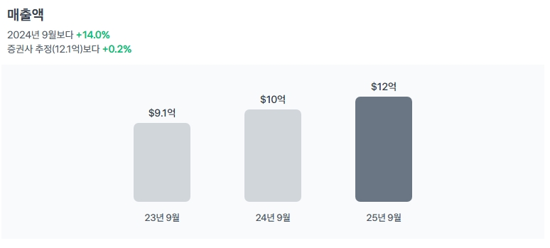 출처 토스증권 - 매출액 성장: 2025년 9월 기준 약 1.7조 원($1.2B)의 매출을 기록했습니다. 이는 전년 동기 대비 약 14.0% 성장한 수치로, 꾸준히 덩치를 키워가고 있습니다.