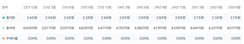- 총자본 약 2.7조 원, 총부채 약 4,617억 원으로 막대한 현금성 자산을 보유하고 있습니다.