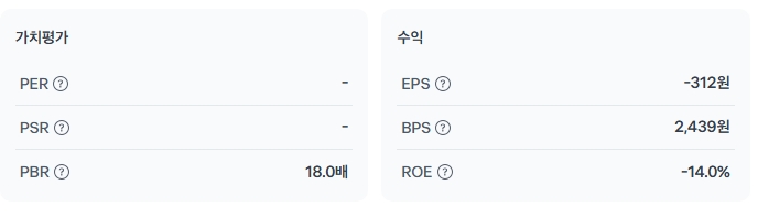| 밸류에이션 | 2 | PBR 18배, 적자 상태. 고평가 논란을 피할 수 없습니다. |