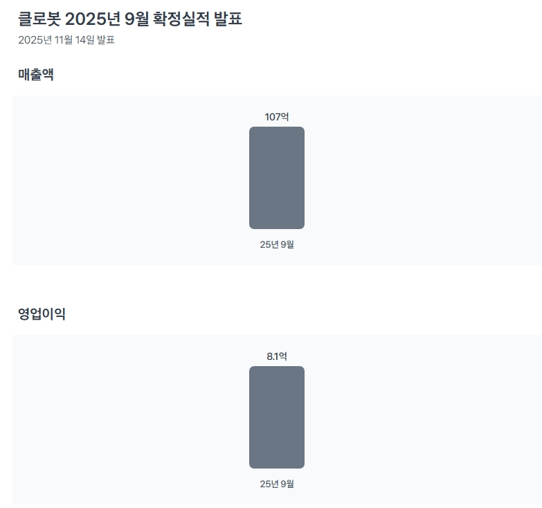 - 매출액: 2025년 9월(3분기) 기준 107억 원을 기록했습니다. 직전 분기 26억 원 대비 폭발적으로 성장했습니다. (계절적 요인과 대형 수주 반영)