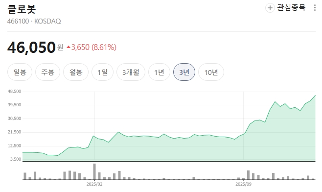 - 상승 요인: 로봇 산업의 개화, 대기업들의 로봇 도입 확대 소식, 그리고 25년 3분기 흑자 전환 소식이 주가를 끌어올린 트리거로 보입니다.