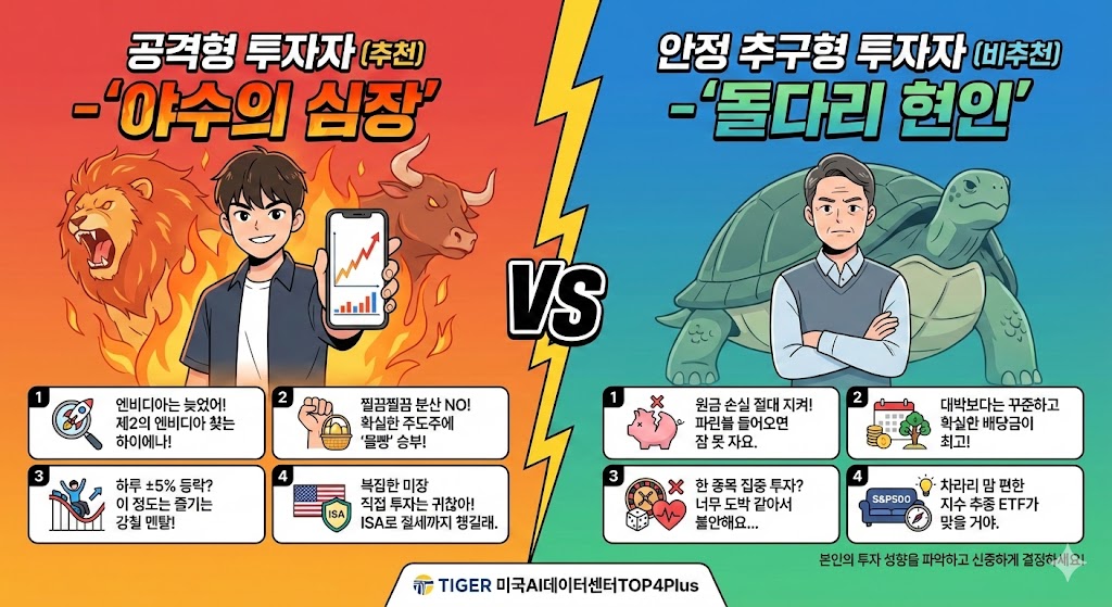 * 변동성이 큰 포트폴리오가 불안하신 분TIGER 미국AI데이터센터TOP4Plus는 AI라는 거대한 파도 속에서 '데이터센터'라는 핵심 섹터를 골라 대장주에 집중 투자하는 날카로운 칼 같은 상품입니다.
