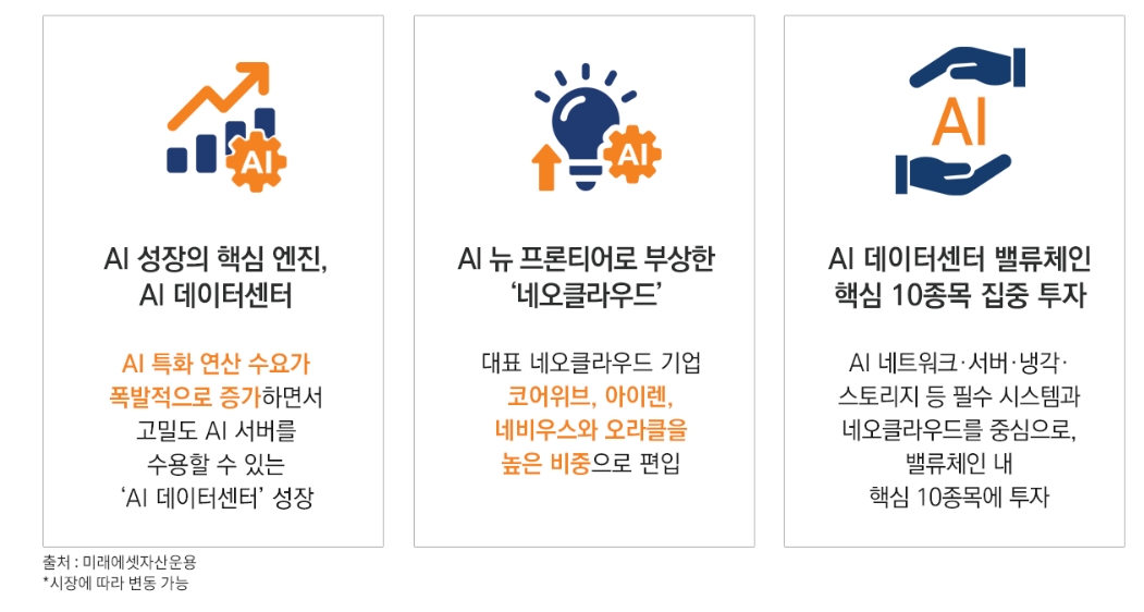 출처 미래에셋자산운용 순위 종목명 비중(%) 기업 특징 1 CoreWeave(코어위브) 17.86% 엔비디아가 투자한 GPU 클라우드 강자 2 IREN(아이렌) 15.32% 채굴 인프라에서 AI 데이터센터로 완벽 변신 3 Nebius Group 14.65% AI 인프라 및 전용 클라우드 서비스 전문 4 Oracle(오라클) 13.33% 데이터센터 확장 전략에 올인 중인 전통 강호 5~10 기타 관련주 잔여 비중 Applied Digital, Credo 등 하드웨어 솔루션주 핵심 포인트: 빅테크(MS, 구글 등)보다는 실질적으로 인프라 수요에 따라 매출 성장이 가파른 '전문 기업'에 집중하고 있습니다. 특히 엔비디아의 파트너인 코어위브나 비트코인 채굴 인프라를 AI로 전환한 아이렌 같은 종목들이 포트폴리오의 색깔을 명확히 보여줍니다.
