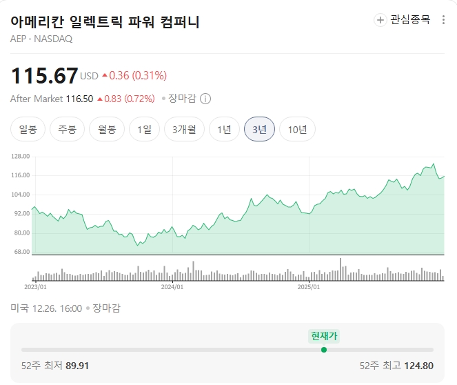 2025년 12월 말 기준 주가는 115.67달러 선에서 형성되어 있습니다. 선행 P/E는 약 19.2배로 업계 평균보다 높지만, 시장이 AEP를 'AI 인프라주'로 재평가하고 있다는 점을 고려해야 합니다.