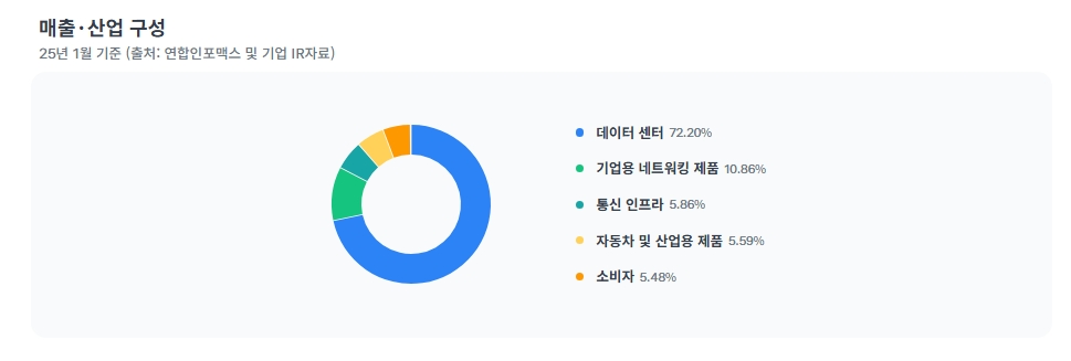 출처 토스증권 - 데이터센터 집중 구조: 전체 매출의 72.33%가 이 부문에서 발생하며 AI 확장세에 직접 연동됩니다.