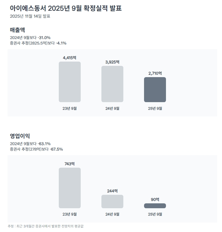 출처 토스증권 매출 및 영업이익: 2025년 3분기 매출은 전년 대비 약 31% 감소한 2,710억 원을 기록했으며, 영업이익은 90억 원으로 63.1% 급감하며 시장 기대치를 하회했습니다.