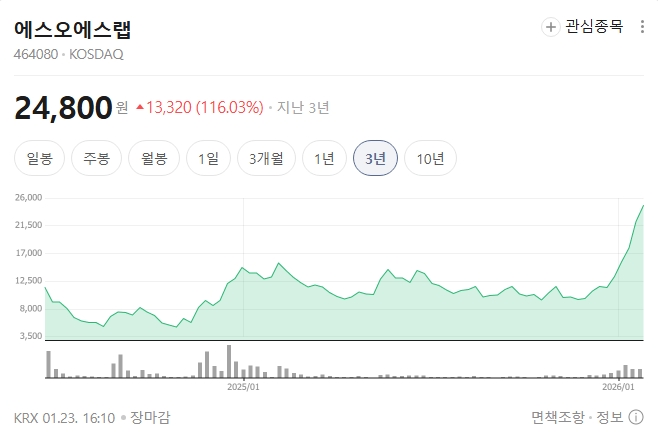 항목 내용 기업명 (주)에스오에스랩 시가총액 약 4,414억 원 (현재가 24,800원 기준) 상장일 2024년 6월 25일 주요 변곡점 '투자주의종목' 지정, 동운아나텍 등 대형 수주 본격화 핵심 사업 모델