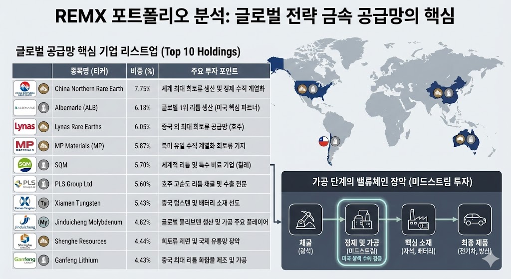 REMX는 단순히 땅에서 광물을 캐는 기업에만 투자하지 않습니다. 실제 가치가 발생하는 Mid-stream(정제/가공) 단계의 기업들을 비중 있게 다룹니다.