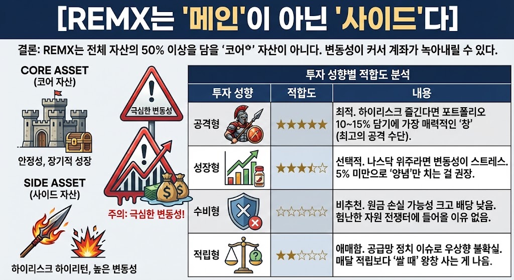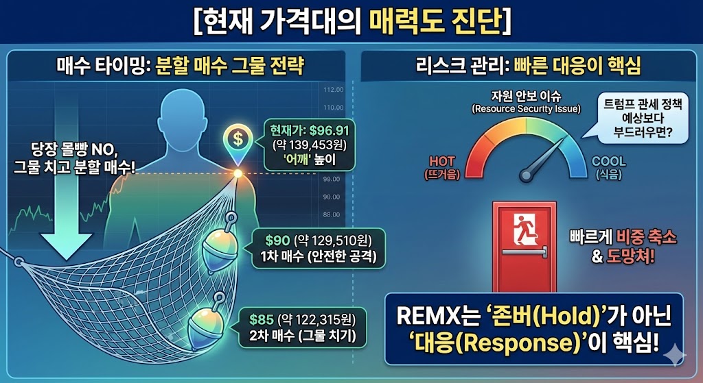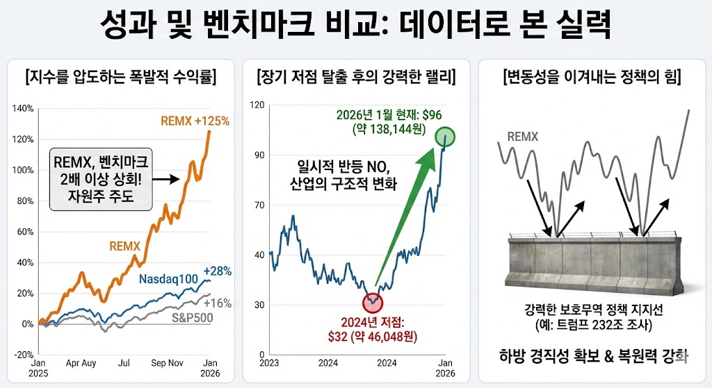 최근 S&P500 등 주요 지수와 비교했을 때, REMX는 원자재 가격 반등과 맞물려 강력한 상대 수익률을 보여주고 있습니다. 2024년 바닥을 형성한 이후 기술적 흐름 또한 우상향 채널을 형성하며 안정적인 구조적 변화를 증명하고 있습니다.