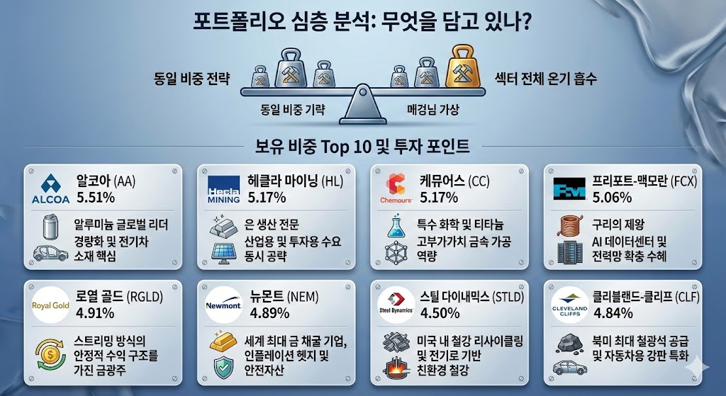 XME의 가장 큰 특징은 시가총액 비중이 아니라 동일 비중 전략을 쓴다는 점입니다. 덕분에 특정 대형주에 휘둘리지 않고 섹터 전체의 온기를 골고루 흡수할 수 있습니다.
