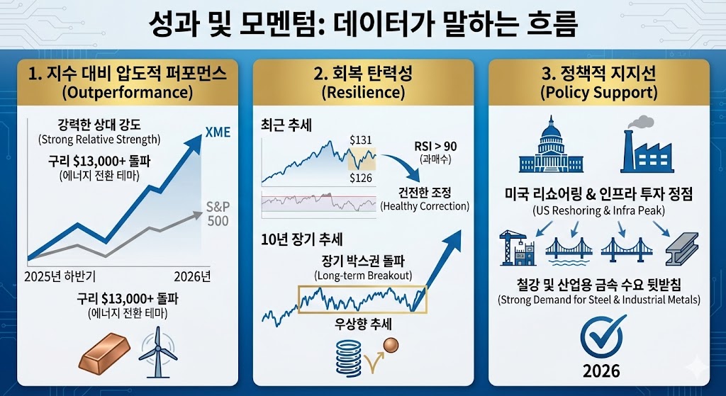 2025년 하반기부터 S&P 500 대비 강력한 상대 강도를 보여주고 있습니다. 특히 구리 가격이 톤당 $13,000를 돌파하며 에너지 전환 테마가 실적으로 연결되고 있습니다. -