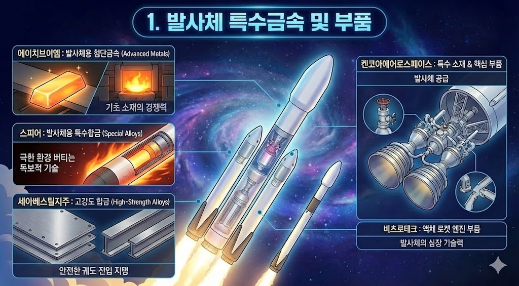 - 켄코아에어로스페이스: 발사체에 들어가는 특수 소재와 핵심 부품들을 전문적으로 공급하고 있습니다.