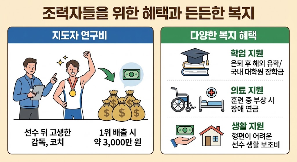 - 의료 및 생활 지원: 훈련 중 부상에 따른 장애 보상이나 형편이 어려운 체육인을 위한 보조비 제도가 운영 중입니다.