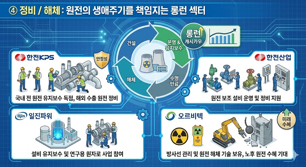 - 현대건설 / 대우건설 / DL이앤씨: 고도의 안전성이 요구되는 원전 시공 능력을 보유한 건설사들로, 특히 현대건설은 국내외 독보적인 실적을 가집니다.